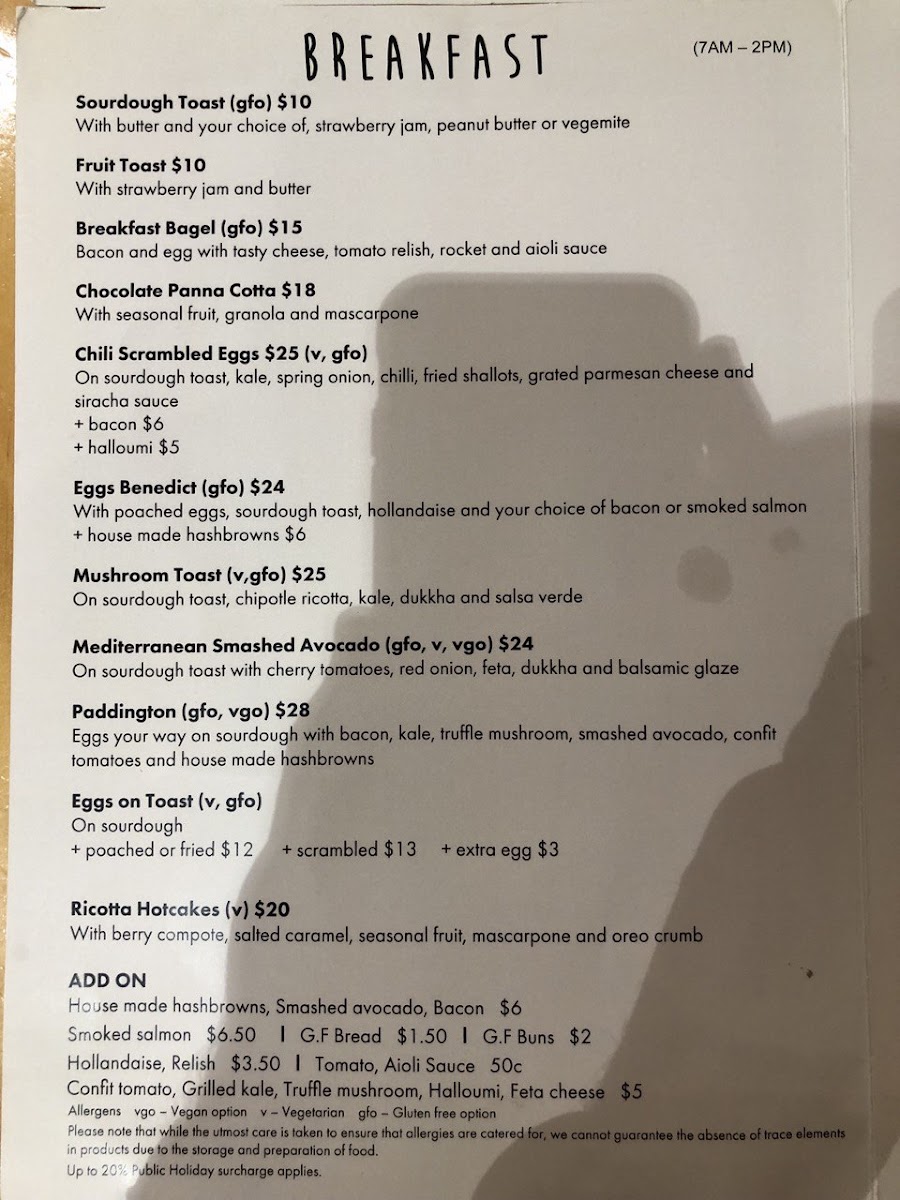 “ The breakfast menu is very reasonably priced from $9 - $27 We received table water & ordered, my husband went for Scrambled Eggs on sourdough toast & added house made hash brown & Istra bacon (for a total $25) & I ordered the Smashed Peas & added on some Istra bacon too (for total $27) Food arrived & it looked well presented & portioned. The eggs were folded delicately, softly set & silky with a liberal sprinkle of seasoning including dried herbs. The chunky hash brown was crunchy & full of rustic Snow White potato. The bacon was cooked well. It was delicious & very filling. My Smashed peas were very colourful & piled high on the sourdough with bacon off to the side. Very tasty, peas were warm & of a creamy consistency, well seasoned with dollops of goats cheese & blistered cherry tomato’s. It also had a grind of herbed seasoning & finished off with black & white sesame, toasted & crushed cumin & coriander seeds on a beetroot hummus smear. So tasty & well flavoured I didn’t need to do a thing but enjoy it. Staff are very friendly & on our Saturday morning visit there were plenty (staff). Overall the presentation, size of portion & quality seasoned ingredients & price, makes it worth a visit & we would go back. ”